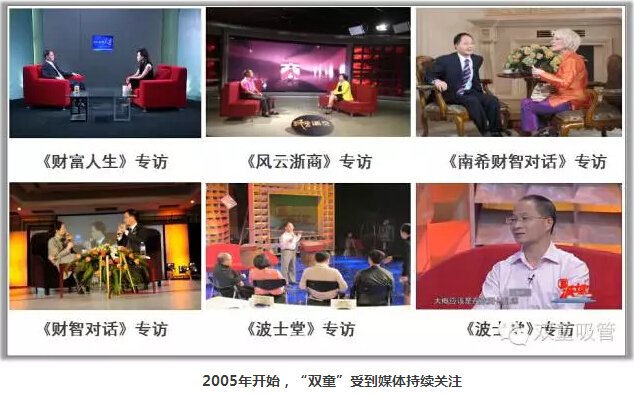 2006年開(kāi)始,中央電視臺(tái)《新聞聯(lián)播》、《焦點(diǎn)訪談》、《財(cái)經(jīng)頻道》、《波士堂》等十幾家國(guó)內(nèi)權(quán)威媒體也關(guān)注到“雙童”,大量報(bào)道“雙童”節(jié)能降耗、員工關(guān)懷等經(jīng)營(yíng)理念。媒體的大量報(bào)道引發(fā)了社會(huì)各界對(duì)“雙童”的關(guān)注,一時(shí)間全國(guó)各地政府企業(yè)組團(tuán)來(lái)“雙童”參觀,光光2007年,“雙童”就接待了共3500位參觀者,在無(wú)形當(dāng)中為“雙童”品牌傳播創(chuàng)造了很好的傳播手段!