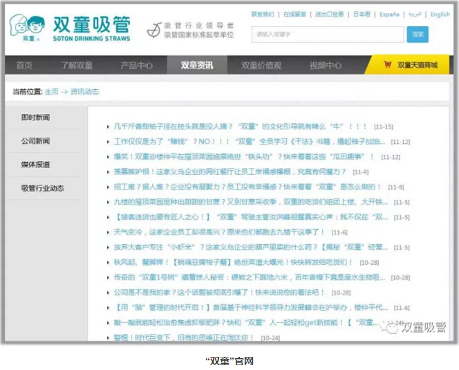 如今,“雙童”專門(mén)設(shè)置有5人編制的文宣部門(mén),負(fù)責(zé)運(yùn)營(yíng)微博、微信、官方網(wǎng)站等十幾個(gè)自媒體應(yīng)用平臺(tái),整體流量和社會(huì)關(guān)注度位于中國(guó)制造業(yè)前列!