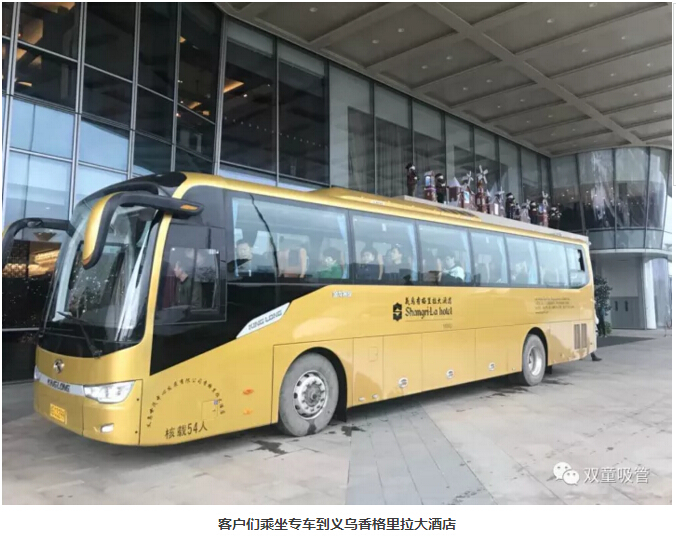 11月17日,參加客戶文化節(jié)的客戶陸陸續(xù)續(xù)的到達了義烏。為了歡迎客戶們的到來,“雙童”早早就訂好了義烏最好的五星級酒店——義烏香格里拉大酒店,并預(yù)定了大巴車專程接送客戶,讓客戶們在最好的環(huán)境中休息。