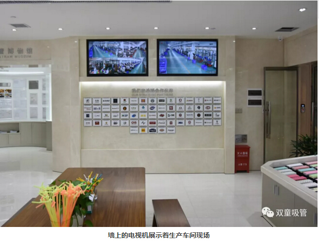 >>> 在“雙童”吸管產(chǎn)品陳列廳的墻面上有兩臺大屏三星液晶電視連接著車間的監(jiān)控端,讓客戶在不進入車間的前提下也能了解到“雙童”的車間生產(chǎn)狀況;